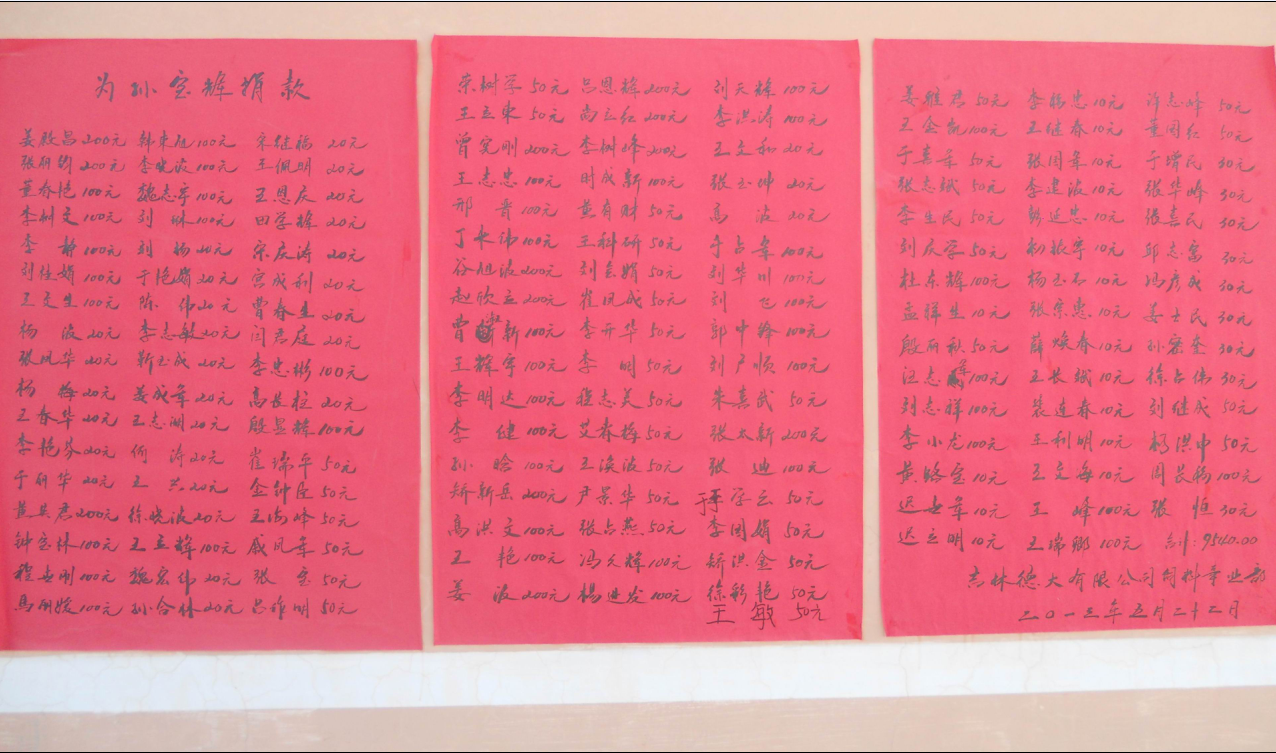 “一方有難,八方支援,奉獻(xiàn)愛心”是中華民族的傳統(tǒng)美德,為孫寶輝同志不錯(cuò)過(guò)最佳治療期,我吉林德大有限公司飼料事業(yè)部全體同仁,在姜殿昌副總經(jīng)理的帶動(dòng)下,于2013年5月22日為孫寶輝同志捐款9540元人民幣,以解其燃眉之急。點(diǎn)點(diǎn)愛心,匯集成河,無(wú)私助人,真情暖人心